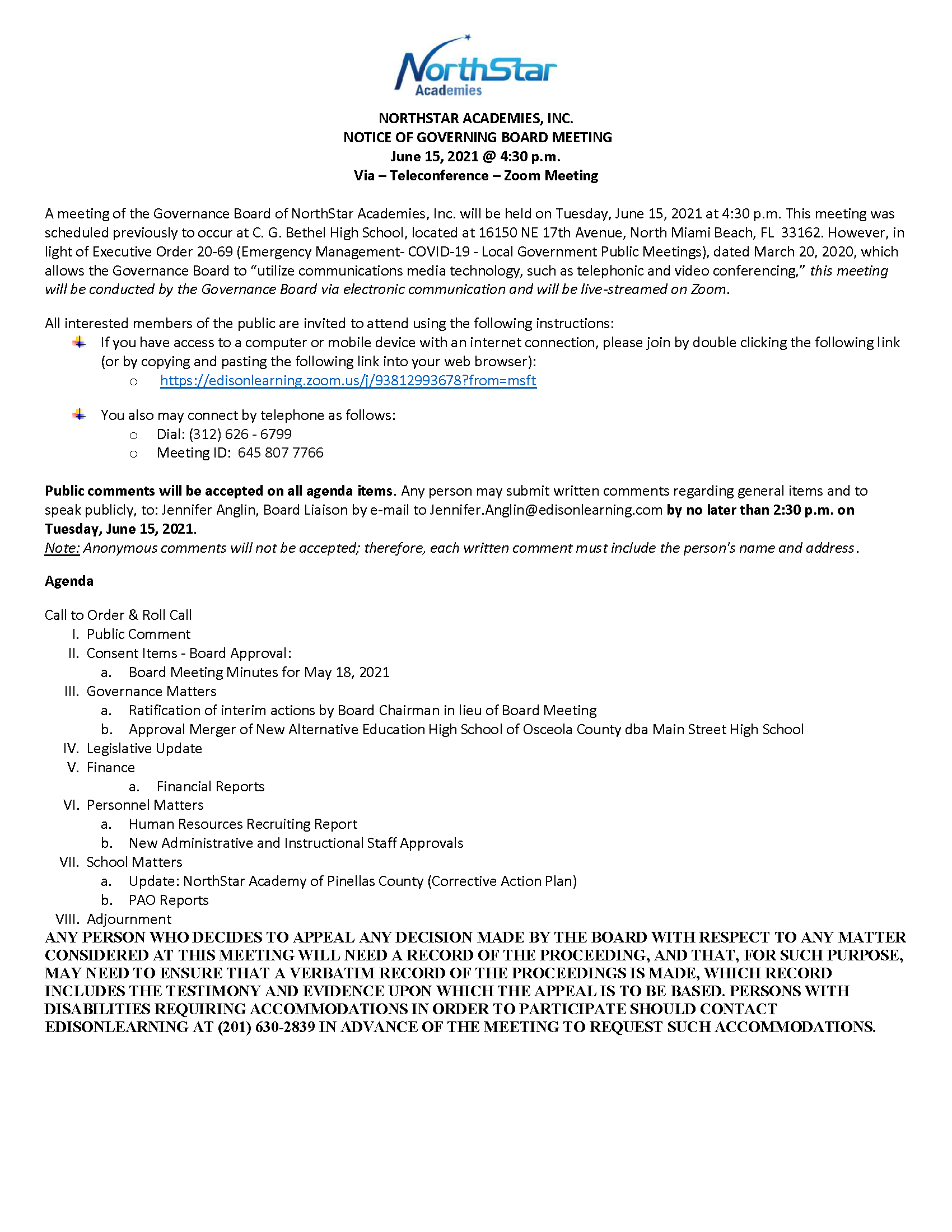 | June | Notice June 7, 2022 NorthStar Academies Inc Board Meeting